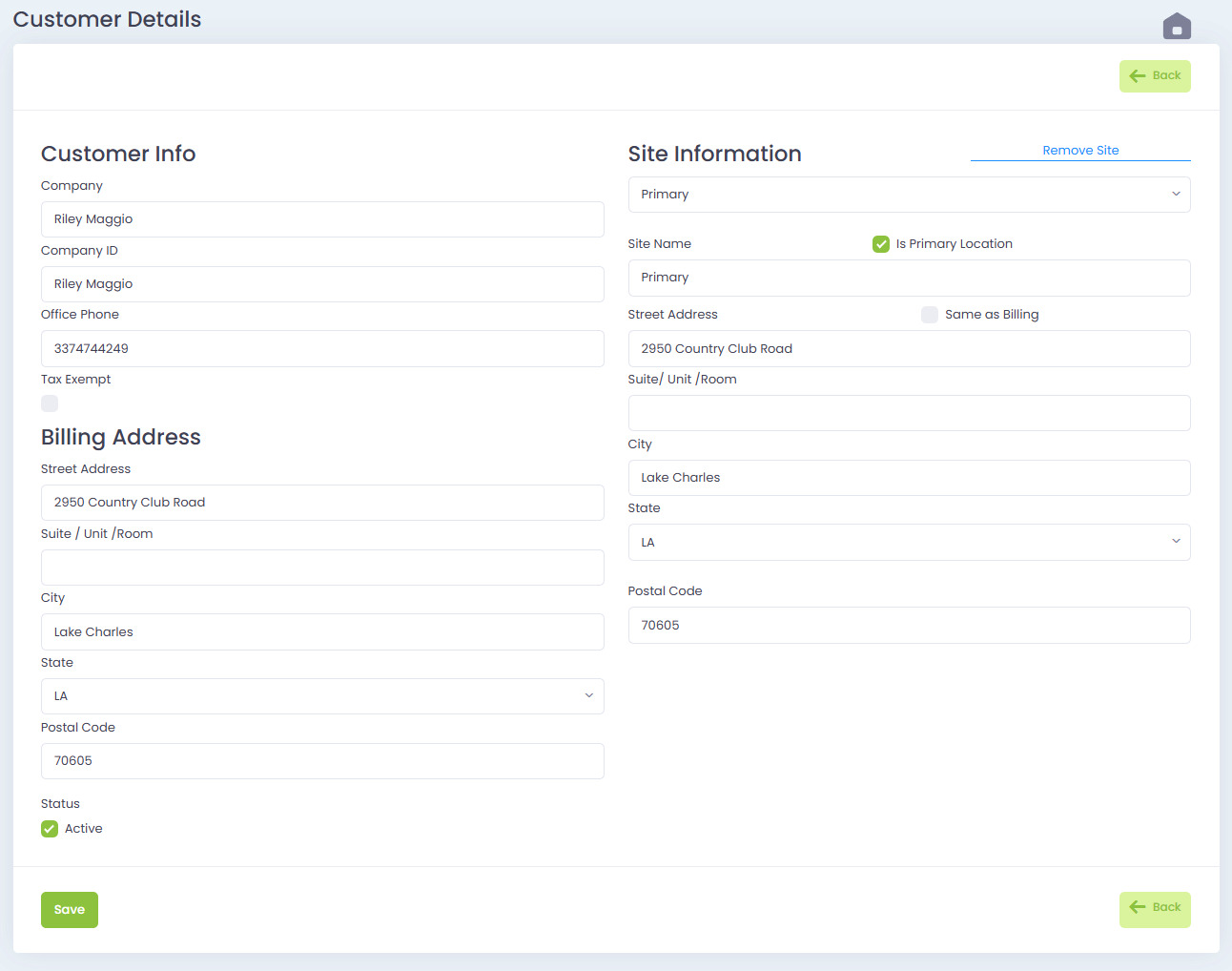 When you click the Edit icon, you’ll open the Customer Info page. This page includes everything needed to maintain accurate records.