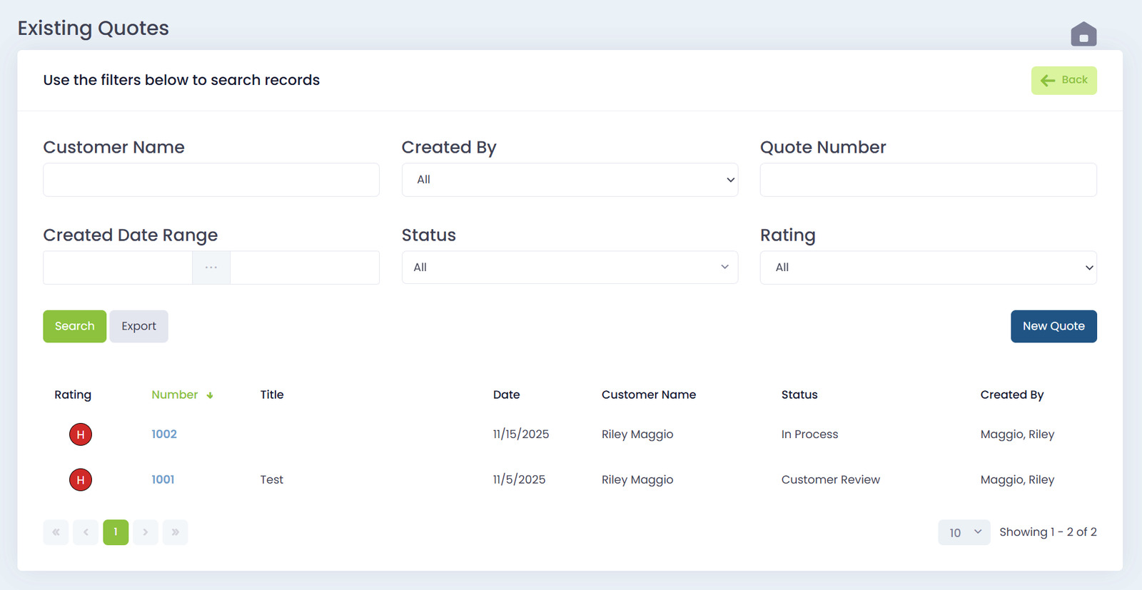 Click the New Quote (plus icon) to jump straight into a new quote using that customer’s information. This keeps the quoting process fast and reduces duplicate entry.
