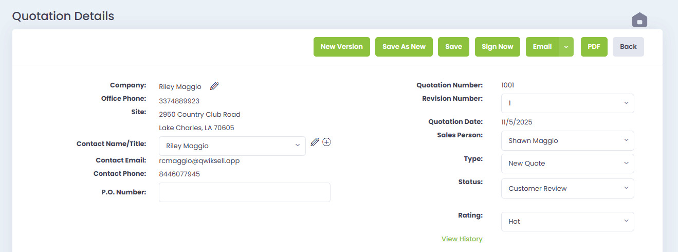 When you open a quote from the Existing Quotes page, you’ll land in the Quote Editor. This is where you adjust customer info, update pricing, add or remove items, check the quote status, and send the quote to your customer.