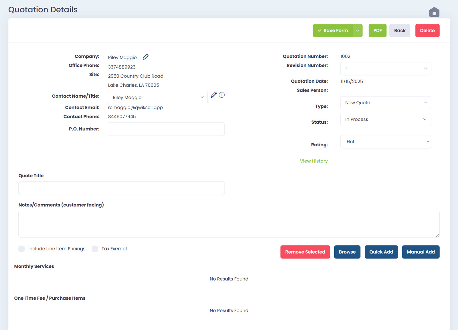 Once you select a customer from the list, QwikSell will open the Quote Details screen.