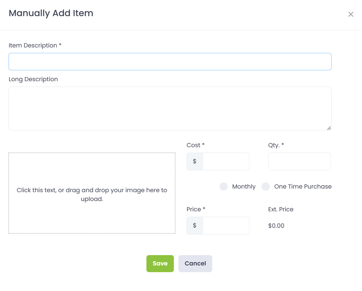 Creates a fully custom item from scratch, including description, price, cost, quantity, and image.