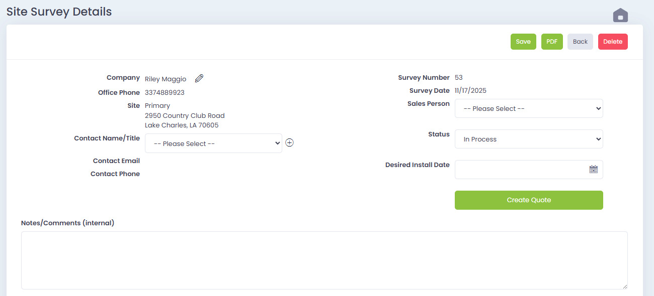The Site Surveys module keeps all onsite discovery information organized in one place. It helps your team record customer details, collect photos, document infrastructure, and hand off clean information for quoting. Everything is easy to search, easy to update, and designed for smooth field-to-quote transitions.